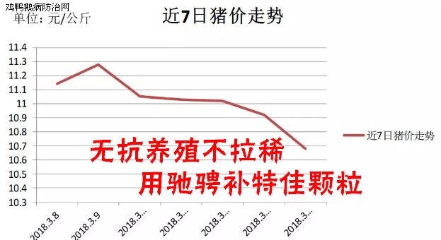据鸡鸭鹅病防治网监测,2018年3月17日全国外三元生猪均价为11.01元/kg,较昨日下跌0.13元/kg;仔猪均价为28.78元/kg,较昨日下跌0.06元/kg;今日白条肉均价14.8元/kg,较昨日减少0.2元/kg。今日猪料比价为4.11:1,较昨日减少0.05;猪粮比5.82:1,较昨日减少0.06。