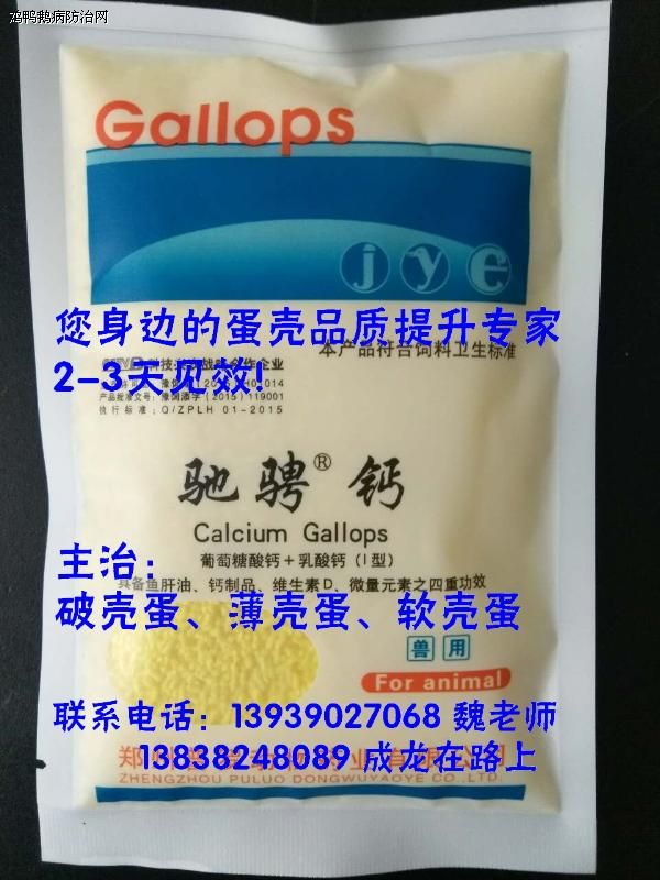 驰骋钙:您身边的蛋壳品质提升专家,2天见效! 1.有效预防“产蛋疲劳症”,即半夜突然发病,两腿僵直后伸,难产、瘫痪等症。2.快速改变蛋壳颜色,发红发亮,好看;3.增加蛋壳厚度,增重;4.减少薄壳蛋、软壳蛋,手触摸鸡蛋手感好,光滑、有质感,提高卖相--驰骋钙。www.jyebfz.com 鸡鸭鹅病防治网 魏老师用心推荐 13939-027-068 微信同步;成龙在路上推广分享 138-3824-8089.