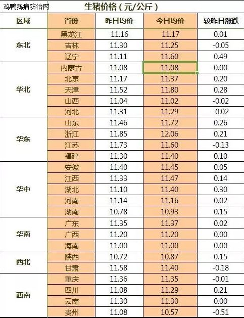 据鸡鸭鹅病防治网监测,2018年6月9日全国各省外三元猪均价为11.25元/公斤,较昨日上涨0.06元/公斤。今日全国26省、直辖市范围内,共计15省份猪价上涨,7省份猪价下跌。全国最高价为浙江,为12.06元/公斤;全国最低价为贵州,为10.57元/公斤。内蒙古、广西、海南与昨日持平。
