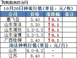 鸭苗市场价格行情:明日上游端鸭苗、种蛋价格苗稳蛋涨,试探上扬。北方区鲁豫皖苏规模冷藏企业合同投放正常,孵化厂家出苗渐增、报价稳定,目前品牌苗厂报价盘桓于6.4元/羽一线两周有余。华南方面粤桂两地大鸭行情弱势延续,白鸭价格纷纷跌破4元、市场悲观情绪加重,随着养殖户对高价苗抵触情绪增加,后续南苗走势将面临较大下行调整压力。全国监测区域鸭苗成交均价6.49元/羽,较去年10月同期上涨3.43元/羽,涨幅112.1%,环比9月上涨0.29元/羽。