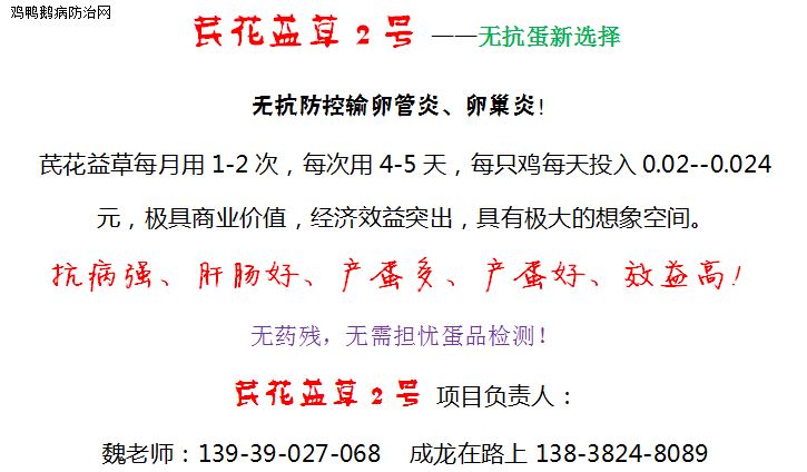 新型无抗发酵纯中药制剂——驰骋养殖安(加味杜仲叶提取物)代替抗生素添加剂,在减少产蛋鸡大肠杆菌(长期使用养殖安对家禽体内大肠杆菌的抑制率达98.8%以上)、沙门氏菌等细菌病的发生,抗球虫(定期使用0.75%养殖安,可大大避免球虫病、过料等问题的发生);提高产蛋鸡的抗病能力,发挥产蛋鸡的高产性能等方面已得到了较好的推广应用效果,并且在使用中取得了明显的经济效益和良好的社会效益。种鸡、种鸭:对种蛋合格率、孵化率、受精率、死陶率等效果显著,用养殖安1次见效,用1月叫好,用2个月后让您的种禽无可挑剔!!!无抗养殖保健专业技师:魏老师在现场13939027068 成龙在路上 13838248089 (微信同步)