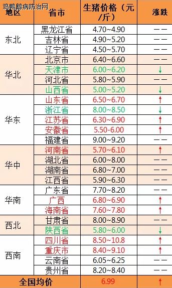 据鸡鸭鹅病防治网监测:2018年12月8日全国外三元生猪均价为13.53元/kg,较昨日上涨0.03元/kg;仔猪均价为21.71元/kg,较昨日持平;今日白条肉均价17.96元/kg,较昨日下跌0.05元/kg。今日猪料比价为4.98:1,较昨日增加0.01。