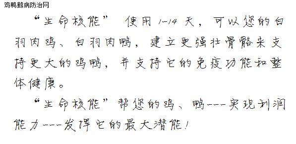 鸡鸭鹅群在免疫接种时,在拌料用养殖安或饮水投服“芪花益草”的基础上,饮水投服“生命核能”,每包兑水2000公斤,连用3-7天。