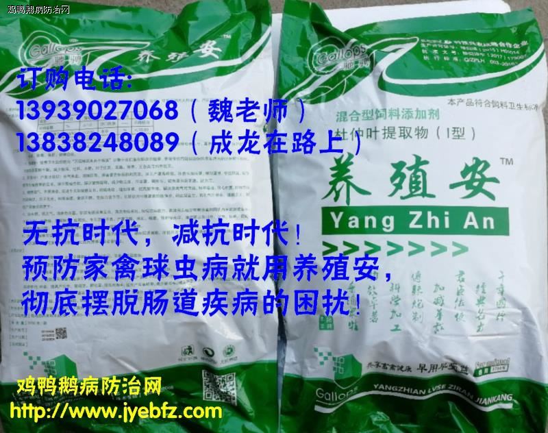 新型无抗纯中药制剂——驰骋养殖安(杜仲叶提取物)代替抗生素添加剂,在减少产蛋鸡大肠杆菌(长期使用养殖安对家禽体内大肠杆菌的抑制率达98.8%以上)、沙门氏菌等细菌病的发生,抗球虫(定期使用0.75%养殖安,可大大避免球虫病、过料等问题的发生);提高产蛋鸡的抗病能力,发挥产蛋鸡的高产性能等方面已得到了较好的推广应用效果,并且在使用中取得了明显的经济效益和良好的社会效益。种鸡、种鸭:对种蛋合格率、孵化率、受精率、死陶率等效果显著,用养殖安1次见效,用1月叫好,用2个月后让您的种禽无可挑剔!!!无抗养殖保健专业技师:魏老师在现场13939027068 成龙在路上 13838248089
