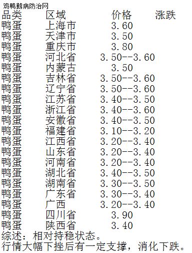 温馨提示:这几天鸭蛋基本稳定,区域不平衡比较突出。以实单实谈商榷交易为准,同一地区可能存在一些差异,上述所报价格仅供参考!