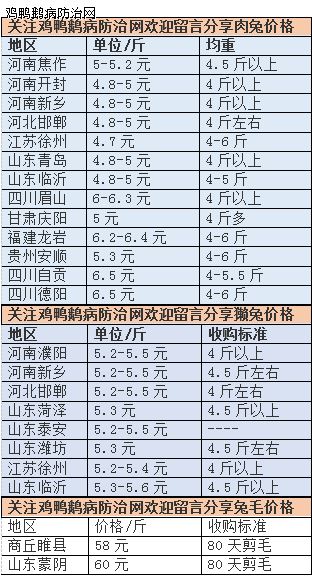 近两天个别地区兔价略微回升0.1-0.2元,目前全国兔价依然说不上上涨,只能说后期也许会有小幅回升的可能,但现在的兔价瞬息万变,谁也无法预测,建议大家做好兔场管理,出栏随行就市。