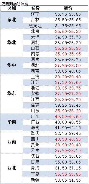 部分省份屠宰厂报价跌幅(元/公斤)情况:辽宁0.1-0.4、吉林0.2-0.4、黑龙江0.2-0.4、河北0.2、河南0.6、山东0.2-0.3、湖北0.2-0.3、湖南0.2、江西1、江苏0.1-0.3、安徽0.2、福建0.2、四川0.2-0.6、重庆0.4、广东0.3、新疆0.5、甘肃0.6。