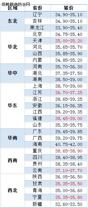 部分省份屠宰厂报价跌幅(元/公斤)情况:辽宁0.1-0.2、吉林0.2、黑龙江0.2-0.6、河北0.2-0.4、天津0.2、陕西0.2-0.3、山西0.2、河南0.2-0.4、山东0.4-0.6、湖北0.2-0.4、湖南0.2-0.4、江西0.2-0.6、江苏0.2-0.4、安徽0.2-0.4、福建0.4、四川0.2、重庆0.2-0.4、广东0.3-0.8、云南0.2新疆2.5。
