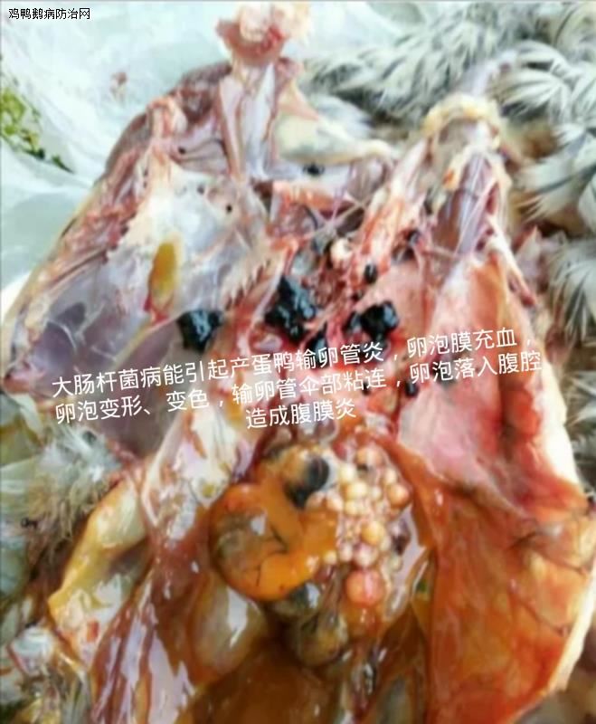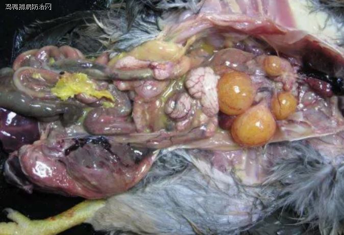 对病鸡进行解剖后发现死鸡大多有卵黄性腹膜炎,肾脏肿大,出血,尿酸盐轻度沉积!输卵管内有炎性分泌物,子宫粘膜水肿!