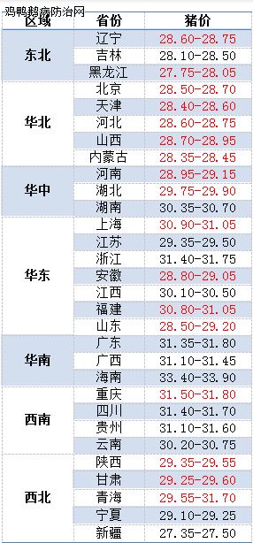 今日部分省份屠宰厂报价涨幅(元/公斤)情况:辽宁0.2-1、吉林0.2-0.6、黑龙江0.2-0.4、内蒙古0.2、天津0.6、河北0.2-0.6、河南0.2-1、山东0.2-1、江苏0.2-0.4、安徽0.4、福建0.4、四川0.1-1、甘肃0.2。