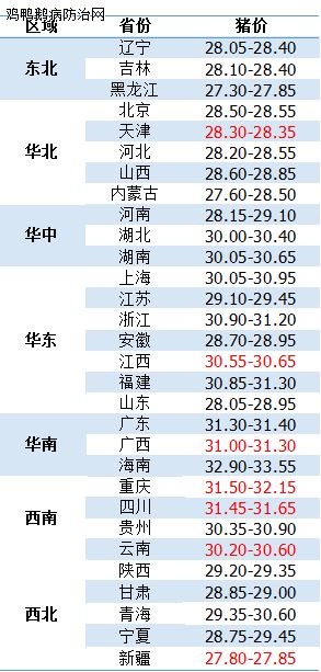 今日部分省份屠宰厂报价跌幅(元/公斤)情况:辽宁0.2-1、吉林0.2-0.6、黑龙江0.2-0.6、内蒙古0.4、天津0.8、河北0.2-0.8、陕西0.2-0.6、山西0.6-0.8、河南0.2-1.5、山东0.3-1、湖北0.3-1、湖南0.2-0.4、江苏0.4-0.8、安徽0.4-0.8、福建0.4、四川0.1-0.6、重庆0.4、广东0.4-0.5、云南0.6、贵州0.4、新疆0.2-0.5、甘肃0.4-0.8。