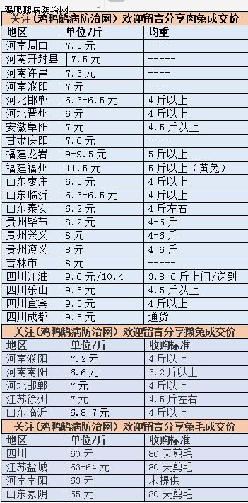 肉兔方面:四川部分地区兔友反馈,近两日走货略微迟缓,价格方面暂时影响不大,山东地区活兔价格前两日有所回暖,但昨日成交价格均价6.3-6.5左右,依然萎靡,河南、陕西地区兔价基本维持7元偏多点价位。