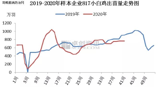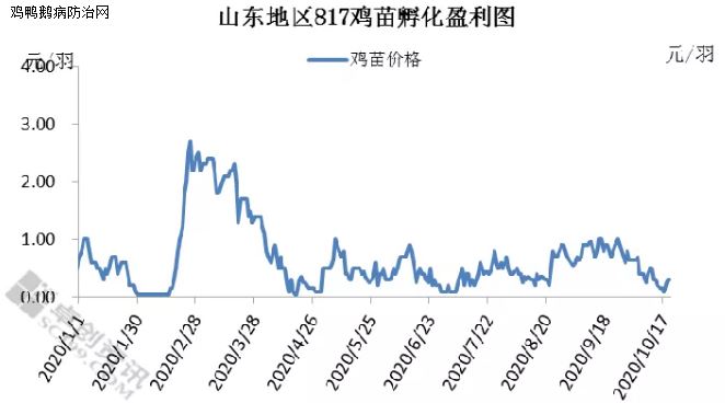 2020年4月末至8月中旬817孵化企业经历了长达4个月的低迷市场,鸡苗价格多在0.50元/羽之下。8月下旬817鸡苗市场终于摆脱低谷,开始上行,9月24日聊城地区鸡苗价格甚至一度上调至1.00元/羽。但好景不长,817鸡苗孵化企业仅仅取得了短暂的盈利,国庆过后,817市场再次陷入低迷时期,至10月20日817鸡苗价格已跌至0.25元/羽。