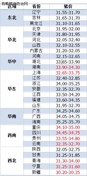 今日部分省份屠宰厂报价涨幅(元/公斤)情况:河北0.4、陕西0.3-0.4、河南0.2-0.6、山东0.2-0.4、湖北0.2-0.3、湖南0.4、江西0.4、江苏0.4-0.5、安徽0.4、福建0.4、四川0.2-0.3、重庆0.6、广东0.3-0.4、贵州0.4、新疆0.5。