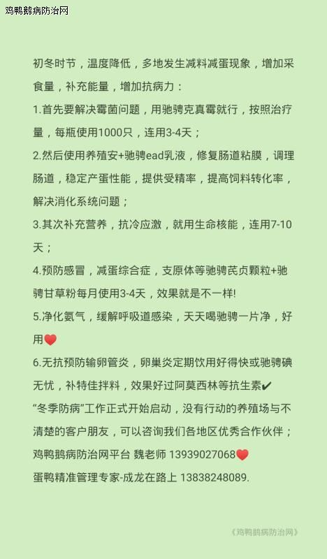 温馨提示:初冬时节、早晚温差大、防寒保暖很重要,同时不忘通风,请做好疫病预防管理工作,重视黄病毒、禽流感的防控,冬春季是鸭鹅产蛋下降、脾脏坏死、黄病毒、副粘病毒、浆膜炎等烈性传染病病的高发期,不可不防,近期产蛋下降、脾脏坏死、霉菌毒素流行泛滥。注意种鸭鹅产蛋下降、禽流感、黄病毒等水禽常见病的防控方案:养殖安+驰骋芪贞颗粒+新力爽+驰骋EAD乳液,混合饮水或拌料,每 月1-2次即可解决!防控禽流感、黄病毒效果就是不一样!水禽疫病实战专家魏老师提醒各位养殖朋友,防控黄病毒不可麻痹大意,要认真对待。 ‘