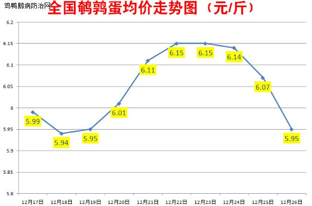 今日鹌鹑蛋价格继续下跌,华东、华中、华北和西北蛋价下跌,东北个别跌。今日鹌鹑蛋报价最高7.0元/斤,最低5.3元/斤。今日全国鹌鹑蛋均价5.95元/斤,较昨日下跌0.12元/斤,均价跌破6元,三连跌,跌势加大。蛋价交流和更新在底部讨论区。