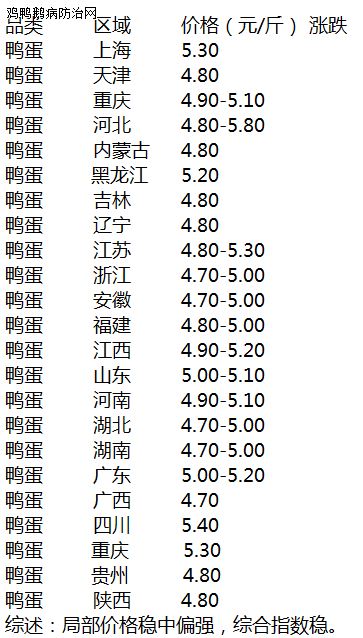 2021年1月1日全国鲜鸭蛋价格:初产至10个头4.1元,10个头至9个头4.4元,9个至8个头4.6元,8个头至7.5个头4.7元,7.5个头以上4.8元(参考值)