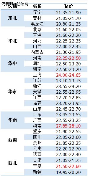 今日部分省份屠宰厂报价跌幅(元/公斤)情况:辽宁0.2-0.8、吉林0.4-0.8、黑龙江0.2-0.8、天津0.4、河北0.3-0.7、陕西0.2、山西0.6、河南0.3-0.6、山东0.2-0.4、湖北0.2-0.7、湖南0.2、江西0.4、江苏0.2-0.5、四川0.2-1、重庆1、云南0.2、新疆0.5、甘肃0.8-1.1。