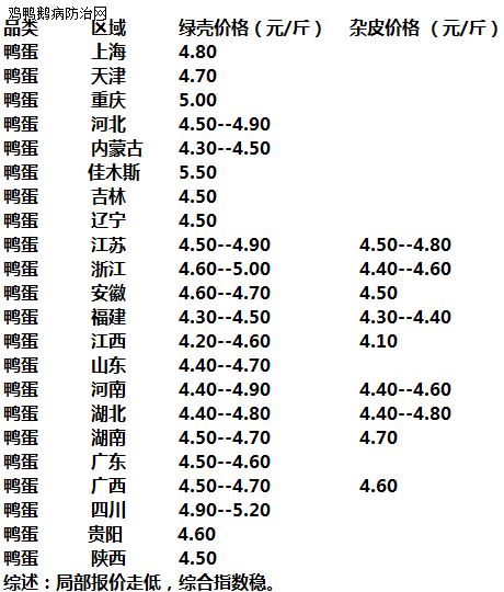 2020年5月1日 全国鸭蛋价格稳定为主、部分区域降价