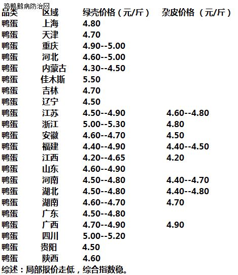 2020年5月15日 全国鸭蛋价格稳定为主、部分区域上涨