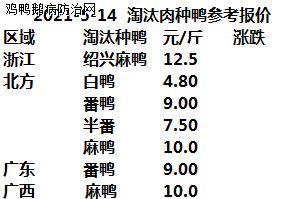 淘汰鸭:活禽市场10.5元-10.8元/斤左右。屠宰厂收购价8.50元/斤左右,淘汰种鸭4.6- 4.8元/斤;淘汰鸭价格受毛色,体重,品种等影响的变化较快。(本报价仅供参考以实际成交价格为准)。