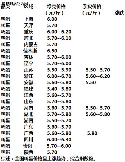 2020年11月30日 全国鸭蛋价格稳定为主,全线价格上涨