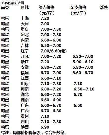 全国鸭蛋均价稳定在6.5-6.9元左右,青壳鸭蛋:主流价6.70-7.30元/斤。