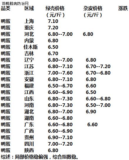 全国鸭蛋均价稳定在6.6-6.8元左右,青壳鸭蛋:主流价6.80-7.30元/斤。