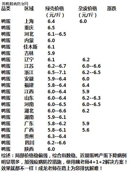 全国鸭蛋均价稳定在5.9-6.4元左右, 青壳鸭蛋:主流价6.00-6.50元/斤。