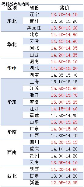 今日部分省份屠宰厂报价跌幅(元/kg)情况:辽宁0.2-0.3、吉林0.2-0.3、黑龙江0.2、天津0.2、河北0.1-0.3、山西0.2、江苏0.3-0.4、安徽0.2-0.4、山东0.2-0.4、河南0.2-0.4、湖北0.3-0.4、广东0.2、湖南0.1-0.5、重庆0.6、四川0.1-0.4、陕西0.1-0.15、甘肃0.2。
