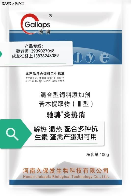 驰骋炎热消一包100g,治疗量兑水1200斤,预防量兑水2000斤可饮水可拌料,不堵水线,安全无药残,解表退热,疏肝解郁,升举阳气,预防家禽受凉感冒,退内热、提神增料效果很好!