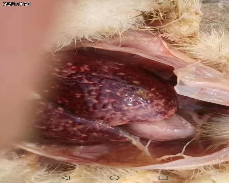 病理变化:脾脏出血斑、坏死灶,后期脾坏死、变硬、萎缩;肝脏肿大伴黄白色坏死点,法氏囊出血,胸腺肿大。