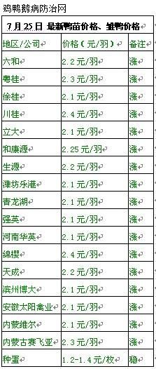 鸡鸭鹅病防治网监测2014年7月25日 最新鸭苗价格、雏鸭价格行情分析:明日鸭苗价格上调0.1元/斤左右,局部地区稳定。冻品走货快,库存减少,北方毛鸭价格上涨带动,鸭苗数量偏少,合同发放积极。南方天气转好,鸭苗有所上升。根据产品、鸭苗及合同政策现状判断,预计近期鸭苗价格呈上涨趋势,局部地区稳定。受行业人士对购蛋孵化乐观态度的影响,加上种蛋较少,孵化企业购蛋积极性较高,种蛋价格弱势上涨。