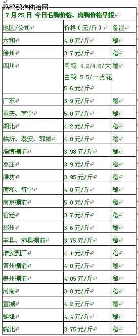 鸡鸭鹅病防治网监测2014年7月25日 今日毛鸭价格、肉鸭价格早报行情分析:毛鸭价格基本稳定,冻品走货快,北方市场毛鸭少,合同量不能满足屠宰需求,市场收购竞争激烈,毛鸭价格维持高位。南方毛鸭出栏集中,价格稳定为主。根据现状、毛鸭存栏量、疫情影响等因素判断,预计近期毛鸭价格以稳为主,局部震荡调整趋势。