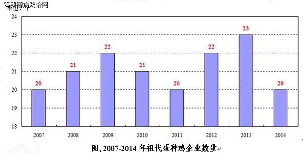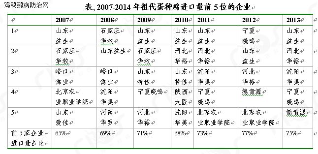 2007-2014年祖代蛋种鸡企业数量变化不大,在20-23家之间波动,其中2014年为20家,但比较有影响力的祖代蛋种鸡企业仅有5、6家,呈现集中化趋势。2012年和2013年前5家企业祖代蛋种鸡进口量占进口总量的比例在75%左右,而2007年和2008年低于70%。