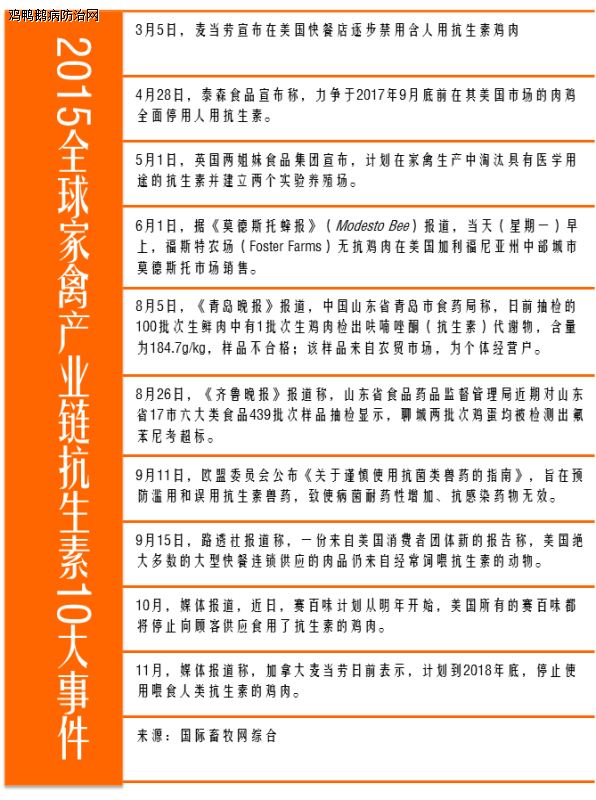2015年1月27日-29日,在美国举行的IPPE展会期间举行的世界家禽科学大会上,与会专家对无抗家禽养殖议题展开了深入探讨。此后麦当劳宣布在美国快餐店逐步禁用含人用抗生素鸡肉。紧接着美国泰森食品公司、英国两姐妹集团等公司相继宣布逐步停用将促生长类抗生素用于家禽养殖。 事实上,2014年2月11日,美国快餐连锁店Chick-fil-A就宣布计划在未来5年内在全美所有的连锁店内提供不用抗生素饲养的鸡肉。这个举动也是快餐业第一次承诺提供100%“无抗生素饲养”的鸡肉产品。