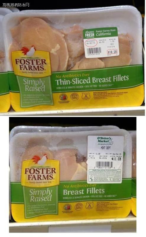据《莫德斯托蜂报》(Modesto Bee)报道,2015年6月1日(星期一)早上,福斯特农场无抗鸡肉(Antibiotic-free Foster Farms chicken)在美国加利福尼亚州中部城市莫德斯托(Modesto) 市场销售。从此新闻稿图片传达的信息显示,此鸡肉当日售价为6.53美元/磅,约合7.2美元/斤,相当于约合44.57元(人民币)/斤。