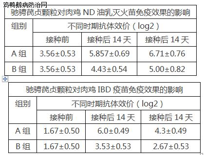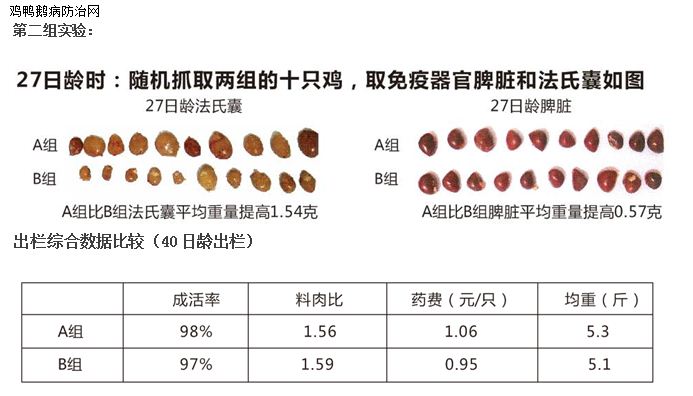 养户张老板,两棚AA肉鸡,每棚1万只,其中一棚免疫前后使用驰骋芪贞颗粒,为A组,另外一棚免疫前后使用黄芪多糖,为B组;分别在不同的日龄对其抗体滴度水平、免疫器官的发育水平进行对比: