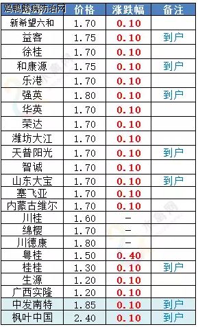 简评:明日鸭苗价格跌后反弹,除西南地区暂稳外,其他主产区均有不同程度上涨,其中北方区品牌孵化企业开票价格普遍上调0.1元/羽,广东大涨0.4元/羽,广西小幅上调0.1元/羽。全国监测区域鸭苗成交均价1.65元/羽,较去年2月同期下跌0.94元/羽,跌幅36.3%。