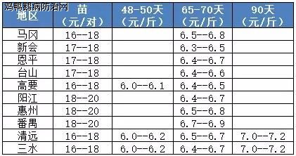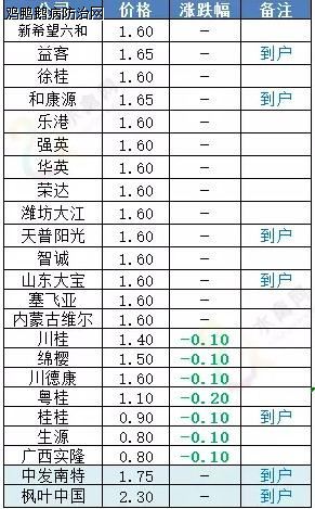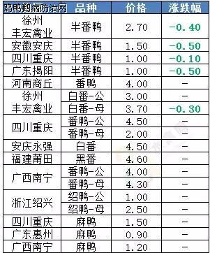 鸡鸭鹅病防治网 简评:明日全国南方鸭苗价格再度下跌,北方大部暂稳。自本月9日赣南等地再度实行活禽市场休市以来,江西、湖南、两广大鸭再度陷入低迷态势。近日南方阴雨连绵、育雏困难,加之持续亏损,养殖户进苗消极。明天南苗价格低位下探,各地跌幅在0.1-0.2元/羽不等,广西地区孵化厂家竞争激烈,进入毛苗时代。北方地区冷藏限价,品牌苗厂开票报价1.6元/羽,中小苗厂实发价格在1.3-1.5元/羽。
