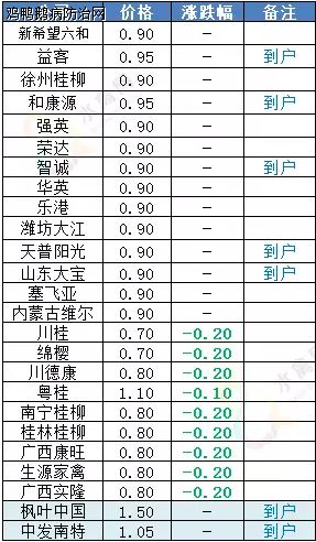 简评:鸭苗价格地区南跌北稳、区域下滑。北方山东、河北等主产区的养殖环保整治、禁养限养区内的养殖场拆迁使业内信心遭到极大挫伤,前景堪忧、朝不保夕,养殖户补栏积极性下降,冷藏合同投放困难,目前北方主产区品牌苗厂开票报价暂稳于0.9元/羽一线;华南区域近期鸭苗价格震荡下滑,明天川渝及两广地区苗厂报价下滑0.1-0.2元/羽不等。全国监测区域鸭苗成交均价0.89/羽,较去年5月同期下跌0.91元/羽,跌幅50.6%。