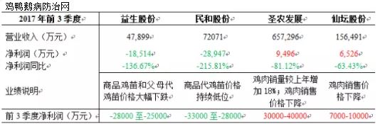 截止10月30日,白羽肉鸡四大上市公司前3季度报都已出炉,一体化屠宰企业圣农发展和仙坛股份保持盈利;而种鸡企业益生股份和民和股份大幅亏损。