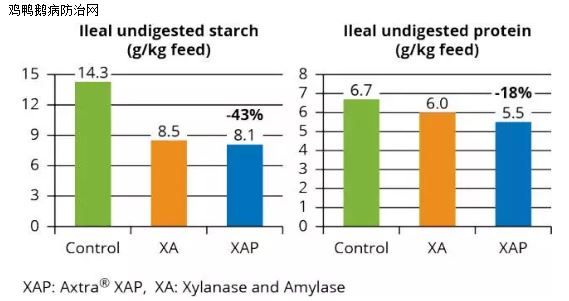图1:木聚糖酶、淀粉酶、蛋白酶的最佳组合使后端肠道中不可消化淀粉、蛋白质分别降低了43%、18%