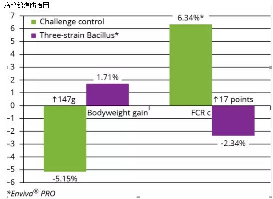 图2: 3种芽孢杆菌提高了感染NE肉鸡的体增重和饲料效率