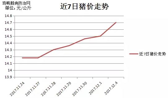 据鸡鸭鹅病防治监测,2017年12月5日全国瘦肉型猪出栏均价7.35元/斤,较昨天上涨0.1元/斤,较去年同期8.53元/斤下跌1.18元。各省均价(元/斤):黑龙江7.3、吉林7.4、辽宁7.5、河北7.3、天津7.4、北京7.3、山西7.2、山东7.4、安徽7.4、江苏7.4、上海7.7、福建7.4、广东7.4、河南7.4、江西7.6、湖北7.5、湖南7.4、陕西7.0、甘肃7.2、四川7.7、云南7.5。