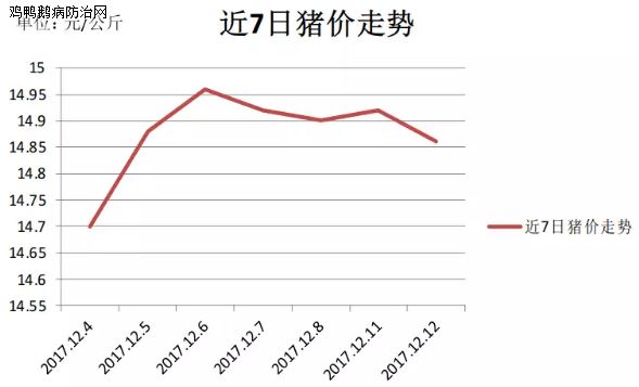 据鸡鸭鹅病防治监测,2017年12月13日全国外三元生猪均价为15.06元/公斤,较昨日上涨0.02元/公斤;仔猪均价为30.88元/公斤,较昨日持平;今日白条肉均价20.92元/公斤,较昨日上涨0.1元/公斤。今日猪料比价为5.66:1,较昨日持平;猪粮比8.91:1,较昨日增加0.01。今日全国瘦肉型猪的出栏均价小幅下跌,各省猪价趋稳调整。东北猪价整体稳定,华北猪价微幅下跌,北京、山西跌0.1元/公斤左右,河北微跌,天津稳定;华东猪价稳中伴涨,安徽小涨0.1元/公斤;华南猪价稳定;华中猪价互有涨跌,河南上涨0.2元/公斤,江西、湖北跌0.1元/公斤,湖南猪价下跌0.2元/公斤;西北猪价上涨,陕西上涨0.3元/公斤;西南稳定。今日全国瘦肉型猪的出栏均价最高在浙江,均价15.81元/公斤,最低在新疆,均价14.0元/公斤。