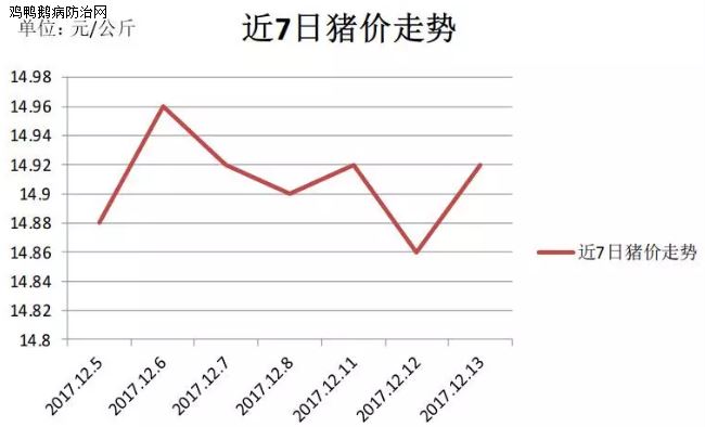 据鸡鸭鹅病防治监测,2017年12月14日全国瘦肉型猪的出栏均价小幅上涨,各省猪价小幅调整为主。东北猪价出现下跌,黑龙江下跌0.2元/公斤,吉林、辽宁下跌0.1元/公斤;华北猪价稳定,河北上涨0.2元/公斤;华东猪价小幅调整,安徽下跌0.1元/公斤,江苏上涨0.1元/公斤;华南猪价稳定;华中猪价稳中伴小跌,河南跌0.1元/公斤;西北猪价下跌,陕西跌0.2元/公斤;西南下跌,四川跌0.4元/公斤。今日全国瘦肉型猪的出栏均价最高在浙江,均价15.80元/公斤,最低在新疆,均价14.00元/公斤。