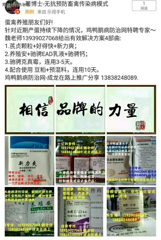 [爱心]魏老师(13939027068)建议朋友们:今天、明天一定要在饲料里面[玫瑰]添加养殖安,饮水中添加[玫瑰]驰骋EAD乳液,即可减少疾病、促进消化、增强抗病能力、提升免疫力、产蛋率稳定! 鸡鸭鹅病防治网 www.jyebfz.com 成龙在路上提醒大家 138-3824-8089. 建议增蛋方案:养殖安+驰骋EAD乳液,一定要定期使用! 经销商朋友一定要学会使用、推广!近10天走访多家鸭老板与种鸭、蛋鸭场60多家,种鹅场20余家。病症很多:主要是采食量下降、产蛋率低、零星死亡、脱肛、掉毛等情况,在驰骋水禽与家禽营养保健与疫病防控研究所--魏老师(13939027068)指导下,提出有效解决方案,多家养殖场通过使用我们的方案,已经获利颇丰、获益匪浅!