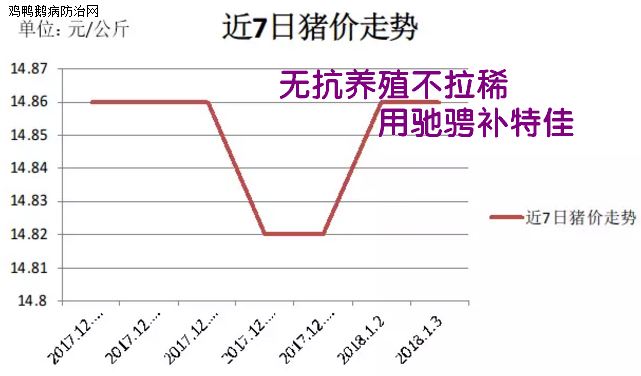 鸡鸭鹅病防治网监测:2017年1月4日全国外三元生猪均价为15.09元/kg,较昨日上涨0.02元/kg;仔猪均价为30.49元/kg,较昨日持平;今日白条肉均价21.02元/kg,较昨日增加0.02元kg。今日猪料比价为5.63:1,较昨日增加0.01;猪粮比8.64:1,较昨日增加0.1。
